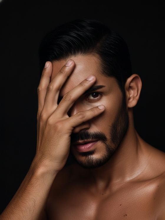 Create a high-detail, realistic portrait using the uploaded photo as the main reference. Preserve the subject’s exact facial structure, skin texture, and identity. The subject should partially cover one side of the face with their hand, leaving one eye and part of the expression visible. The pose should feel intentional and expressive, creating a sense of mystery and emotional depth. Use dramatic, directional lighting to shape the face and hand, producing strong highlights and deep shadows. The lighting should feel cinematic and sculptural rather than flat. Keep the composition minimal and focused, with no distracting elements. The background should be dark and simple, allowing the subject’s expression and gesture to remain the focal point. Style the image as a photorealistic, cinematic vertical portrait with high contrast, sharp facial details, and an intense, moody atmosphere. Vertical aspect ratio (9:16), realistic and professional finish.