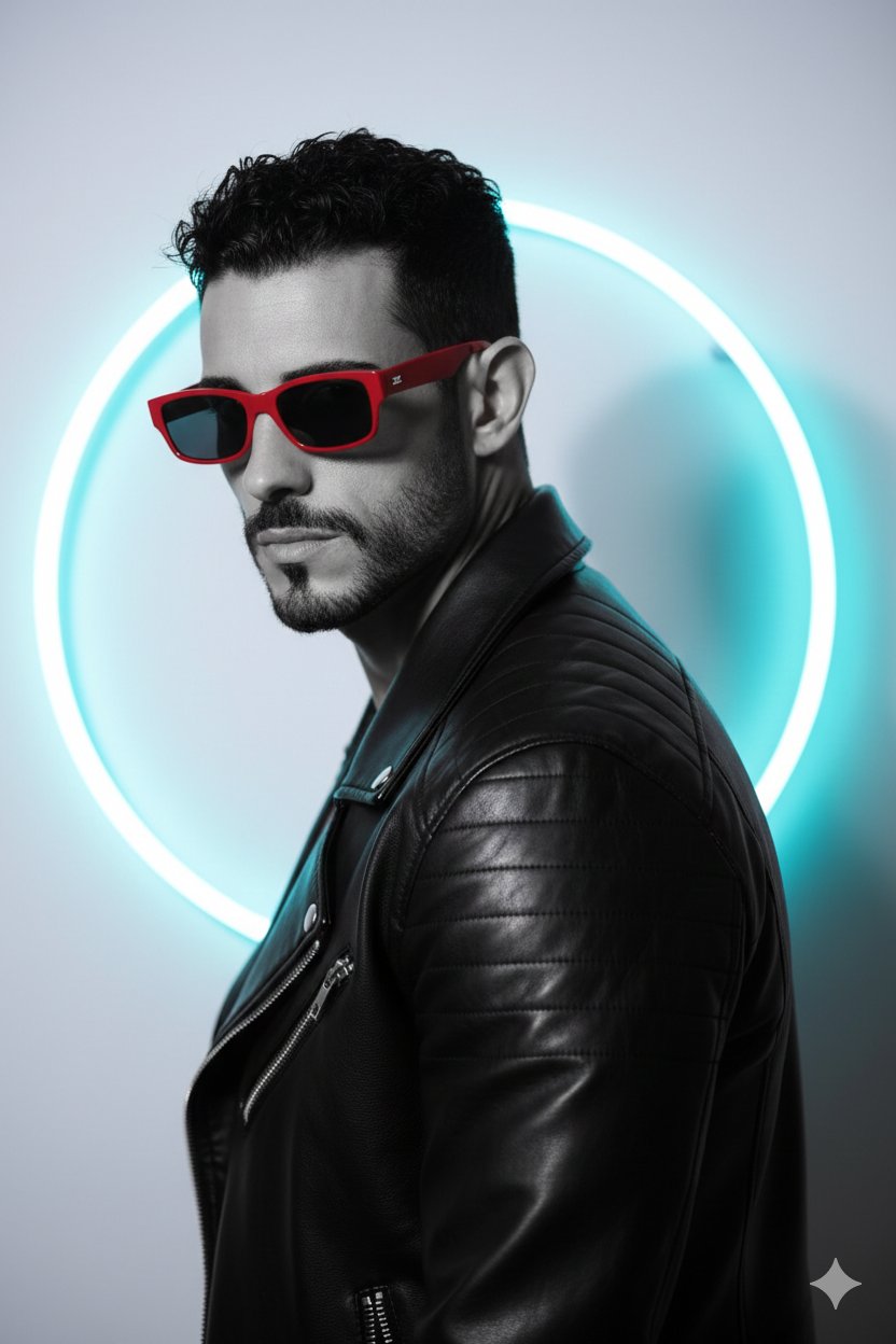Use 100% face above uploaded photo Black and white fashion portrait of a handsome young man in last 27s with black hair and black beard like uploaded photo.looking over his shoulder. He is wearing a stylish black leather jacket and modern rectangular red sunglasses.The background is a seamless, minimalist white studio backdrop with blue circle ring . The lighting is dramatic high-contrast studio lighting, creating sharp focus and