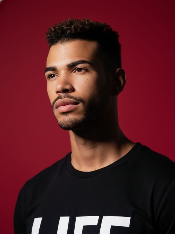 Create a powerful vertical portrait in 1080×1920 format using the uploaded photo as the primary reference. Maintain the subject’s exact facial features, skin texture, and identity with realistic precision. Capture the portrait from a slightly low-angle perspective, with the camera angled upward to emphasize the jawline, neck, and facial structure. The pose should feel confident, controlled, and visually dominant, with a sculptural, editorial presence. Use strong cinematic lighting with sharp contrast — highlights should define the contours of the face while shadows add depth and intensity. The lighting should feel dramatic and intentional, not soft or flat. Dress the subject in a dark, minimal outfit such as a T-shirt featuring bold, clean lettering text reading “LIFE”. The typography should be simple, modern, and clearly readable. Set the background to a rich, deep red tone, fully saturated and uniform, creating a striking contrast against the subject’s skin and clothing. The background should feel bold, graphic, and uncluttered. Final image should feel modern, confident, and cinematic — sharp details, vivid colors, strong contrast, and a visually commanding finish. No stylization that alters facial realism.