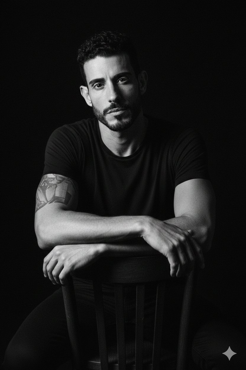 Make this a studio portrait. Adjust the skin tone and give it a cinematic black-and-white color grade. The man is wearing a black shirt and sitting on the back side of a chair. Change the photo angle from eye level. Use a black background. The photo should look realistic in 8K without any pixel loss.