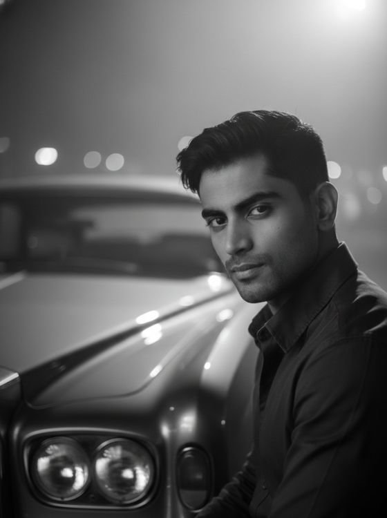 Create a cinematic black and white portrait using the uploaded photo as the main subject. Preserve the person’s exact facial structure, skin texture, hair details, and expression from the original image. Do not change the person’s identity. Place the subject beside a luxury or classic car in a dramatic cinematic scene. The car should appear partially visible in the frame — such as the front side, headlights, hood, or door — adding a strong cinematic presence without overpowering the subject. Use dramatic side lighting with high contrast, deep shadows, and soft highlights, similar to a movie scene shot at night. Add subtle reflections of light on the car’s surface to create depth and realism. The background should be dark and minimal with a cinematic atmosphere, including soft fog, light haze, or faint street reflections. Keep the subject sharply in focus while the car and background remain slightly blurred using shallow depth of field. Style the image as a high-end cinematic black and white film still. Add fine film grain, rich grayscale tones, sharp focus on the eyes, realistic proportions, and a moody, powerful atmosphere. Pure monochrome, no color tint.