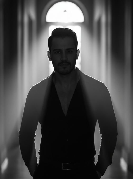 Create a cinematic black and white portrait using the uploaded photo as the main reference. Keep the subject’s exact facial structure, skin texture, hair details, and identity fully realistic and unchanged. Place the subject walking slowly through a dramatic cinematic environment, as if captured mid-scene in a movie. The body should be slightly turned, shoulders relaxed, with a confident and calm stride. One hand may be in the pocket or moving naturally while walking. Use strong directional lighting from behind or the side, creating bold highlights along the edges of the face and body, with deep shadows adding contrast. Light beams should cut through the scene, creating a powerful silhouette effect without hiding facial details. The background should feel atmospheric and cinematic — such as a long hallway, an empty street, or a large open space — softly blurred to create depth. Add subtle haze or mist to enhance the cinematic mood. Style the image as a high-end cinematic black and white film still. Include fine film grain, rich grayscale tones, sharp focus on the eyes, realistic proportions, and a dramatic, confident presence. Pure monochrome, no color tint, professional cinematic quality, vertical portrait orientation (1080×1920), realistic and movie-like finish.